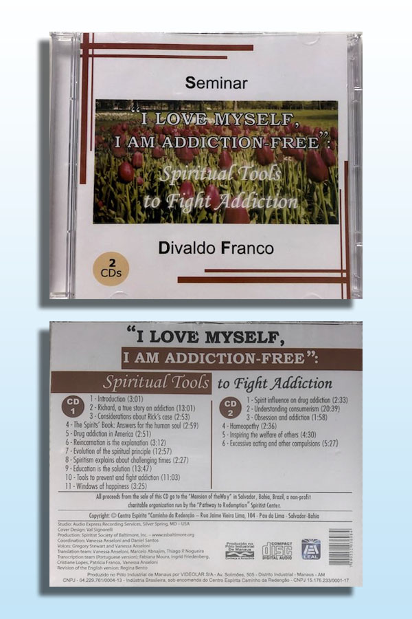 [2 CDs set] Seminar given by the renowned medium Divaldo Franco in Baltimore, MD – USA, 2005 The seminar covered true stories about drug addiction; family issues in drug-addiction; and genetic, psychosocial, socioeconomic and spiritual issues that induce addiction. Divaldo Franco explored academic and spiritual therapies from a Spiritist perspective. He placed special emphasis on the role of education as a critical factor for the health of the whole person.